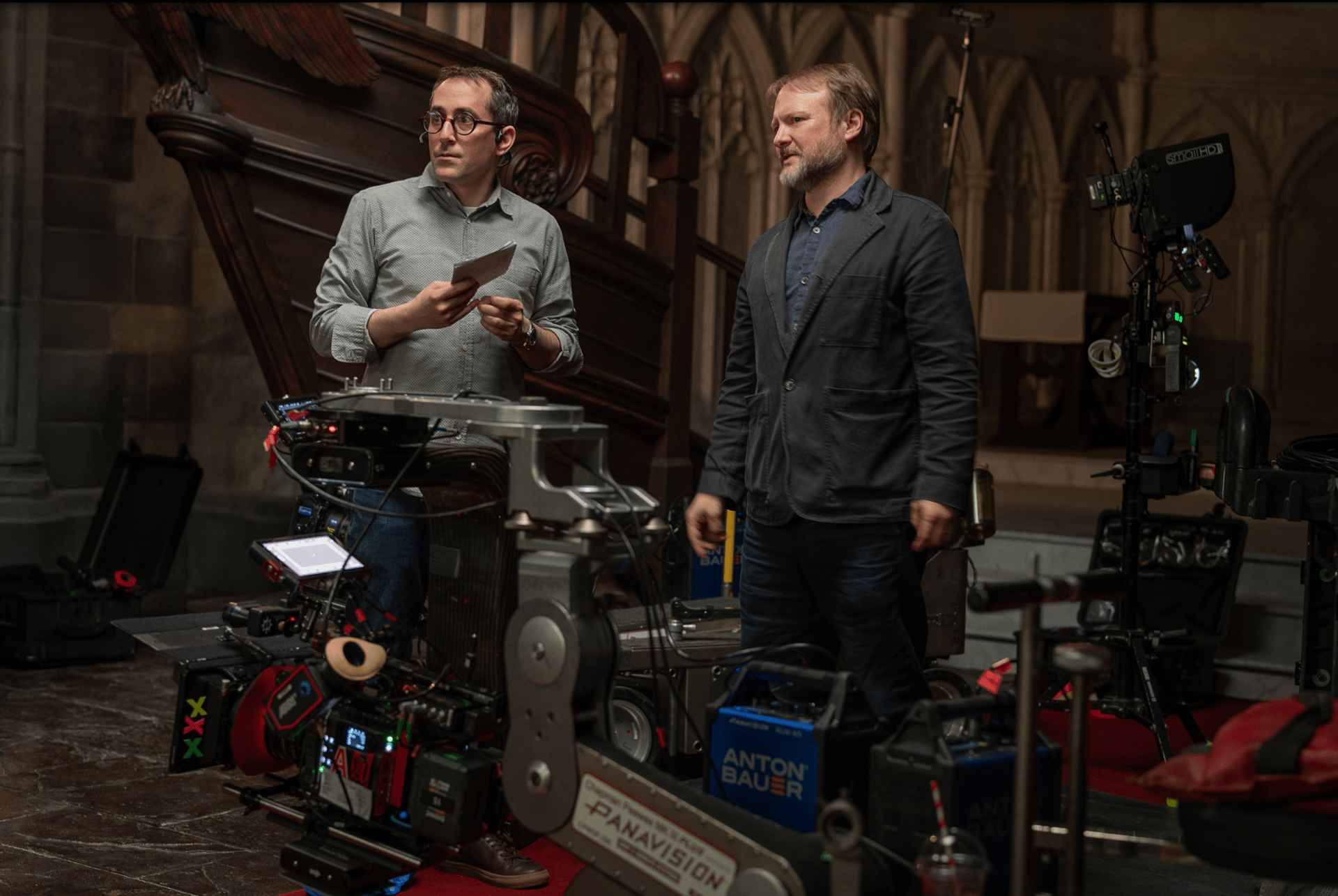 (L-R) Cinematographer Steve Yedlin and Director Rian Johnson on the set of Johnson’s 2025 Whodunit “Wake Up Dead Man.” Image courtesy of Netflix.